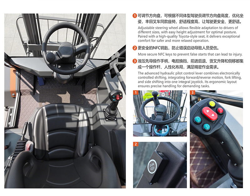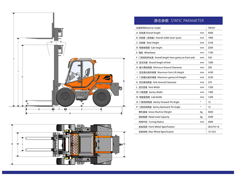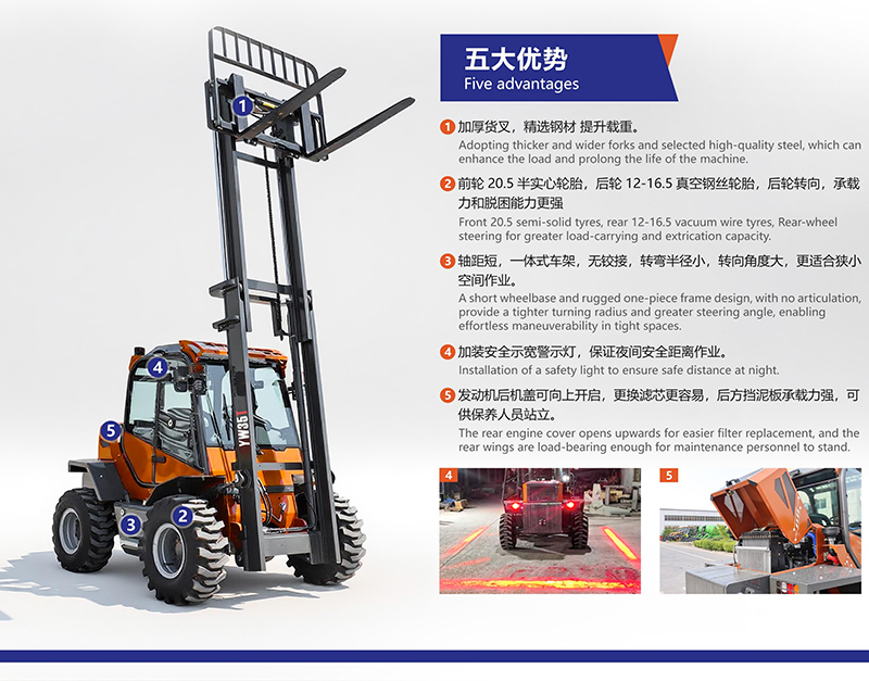 一體式越野叉車(YW35T)為加厚貨叉,精選鋼材提升載重,前輪20.5半實心輪胎,后輪12-16.5真空鋼絲輪胎,后輪轉向,承載 力和脫困能力更強,軸距短,一體式車架,無鉸接,轉彎半徑小,轉向角度大,更適合狹小 空間作業,加裝安全示寬警示燈,保證夜間安全距離作業,發動機后機蓋可向上開啟,更換濾芯更容易,后方擋泥板承載力強,可 供保養人員站立。